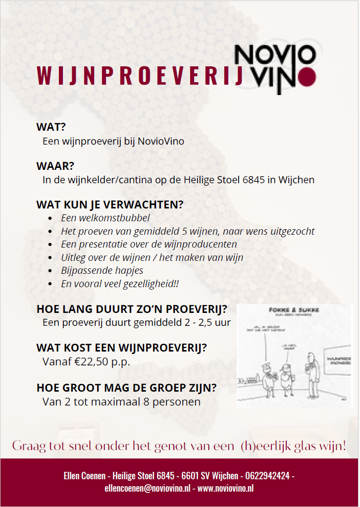 Bij NovioVino ben je altijd welkom om onze (h)eerlijke wijnen te komen proeven. Ook worden er regelmatig wijnproeverijen georganiseerd. De data hiervan zullen binnenkort te vinden zijn op de website en daar kun je dan eventueel op intekenen. Wil je liever zelf met een groepje vrienden, vriendinnen, collega’ s, familieleden of buren een leuke wijnproeverij beleven, neem gerust contact met me op!